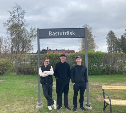 Den finlandssvenska musik- och underhållningsgruppen som vann den svenska melodifestivalen 2025 med låten Bara bada bastu kom lämpligt med tåget till i Bastuträsk innan de åkte till Skellefteå för konserten i Sara Kulturhus. Foto av Lars Westerlund.